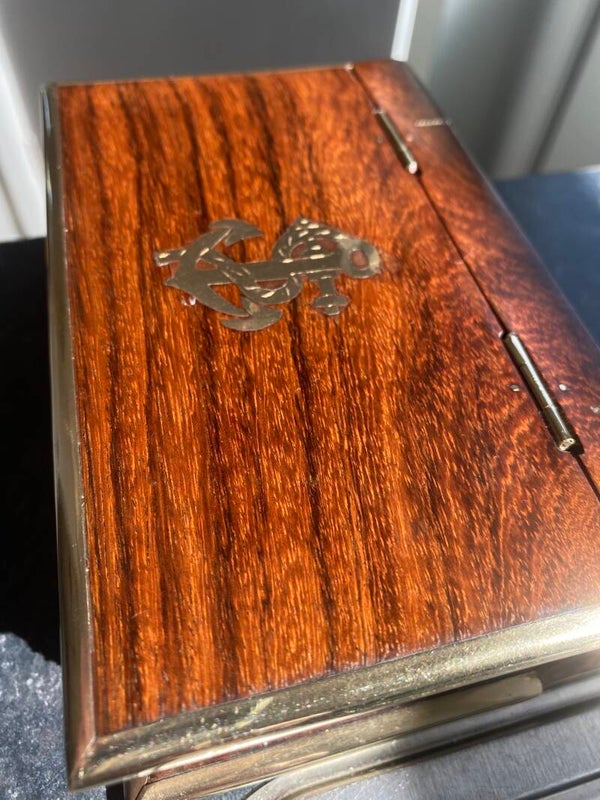 The box features an anchor design made of brass on a rich mahogany wood finish and edged in brass. It is perfect for storing trinkets, keys, or any small treasures you may have. This contemporary piece is ideal for marine enthusiasts and antique collectors alike. The book style design also adds a vintage feel, making it a great addition to any room in your home. Don't miss out on the opportunity to own this unique piece of decor. Measuring. 15cmx10cmx5cm. Presented in excellent condition.