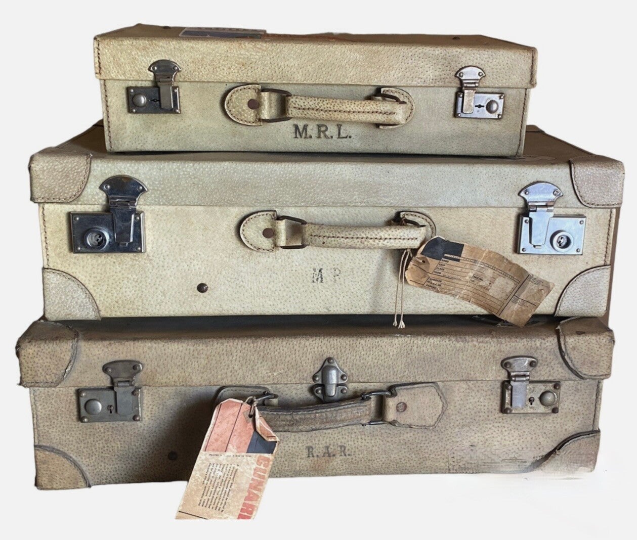 VINTAGE MONOGRAMED SUITCAS SET WITH CUNARD BOARDING LABELS