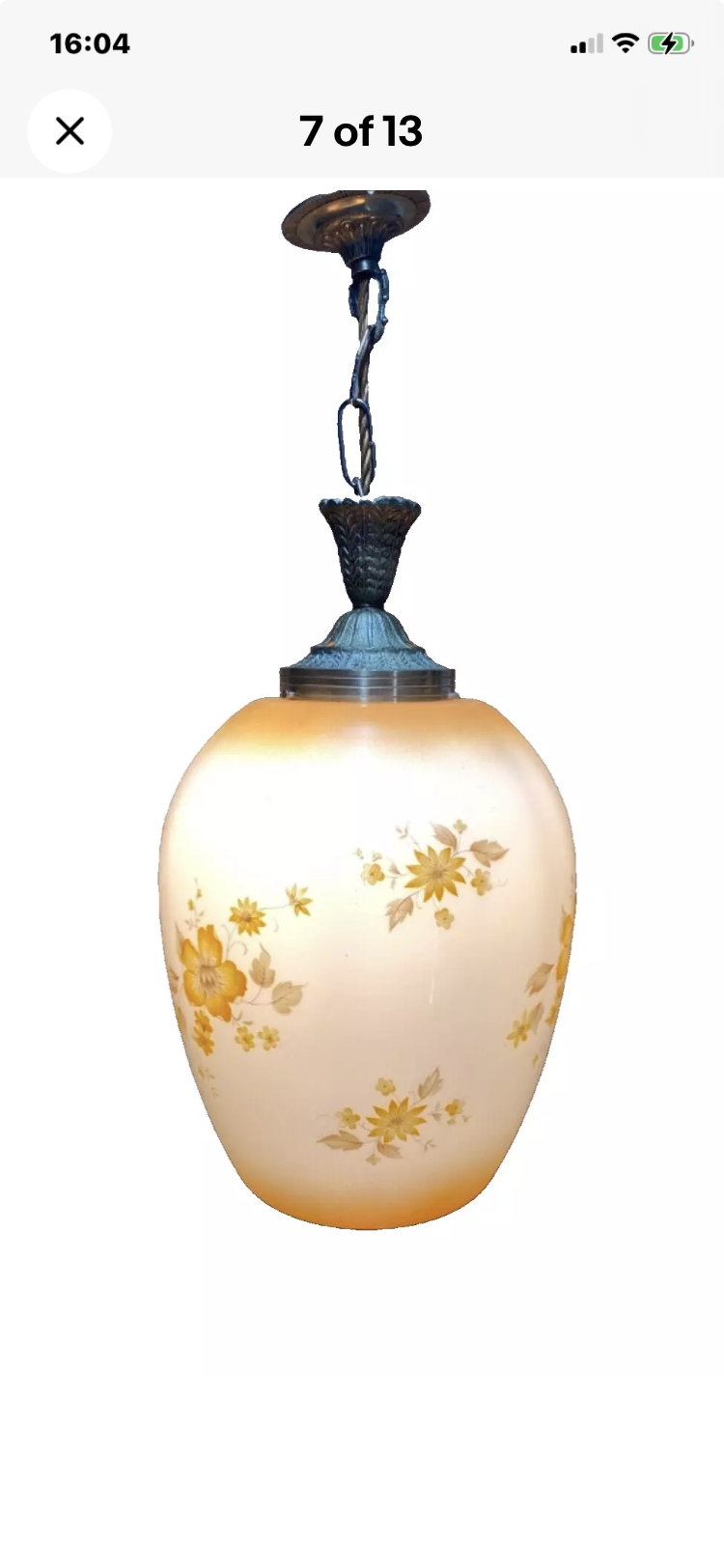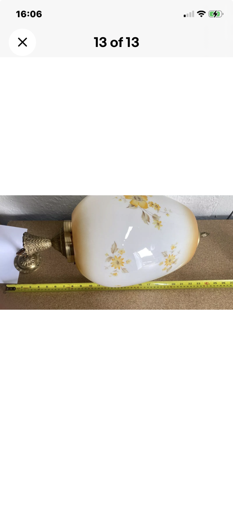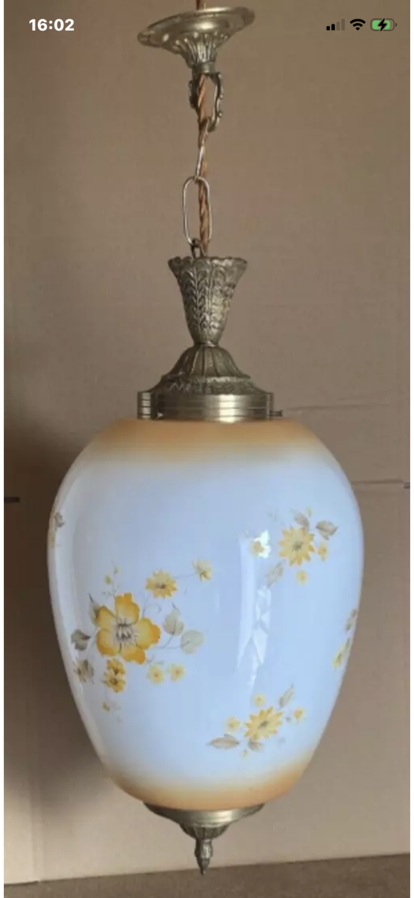 Large white opaque oval shaped shade with floral painted design. With brass finials top and bottom and suspended with brass chain from a brass ceiling rose.