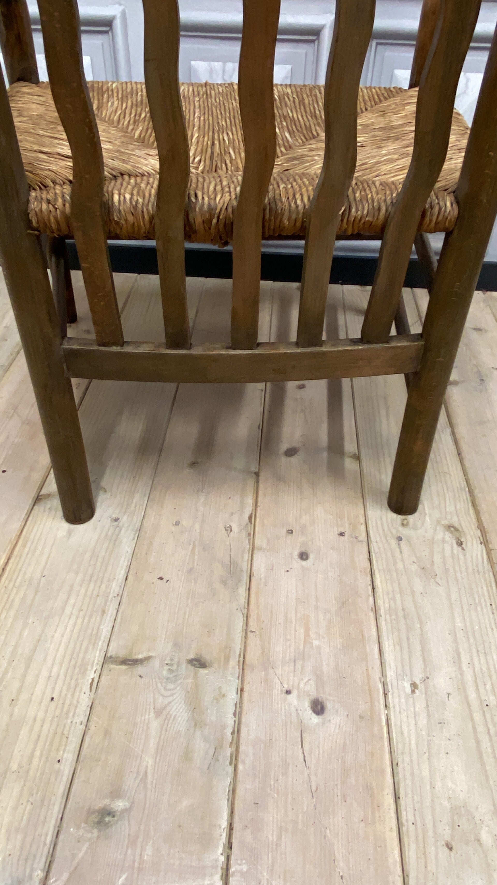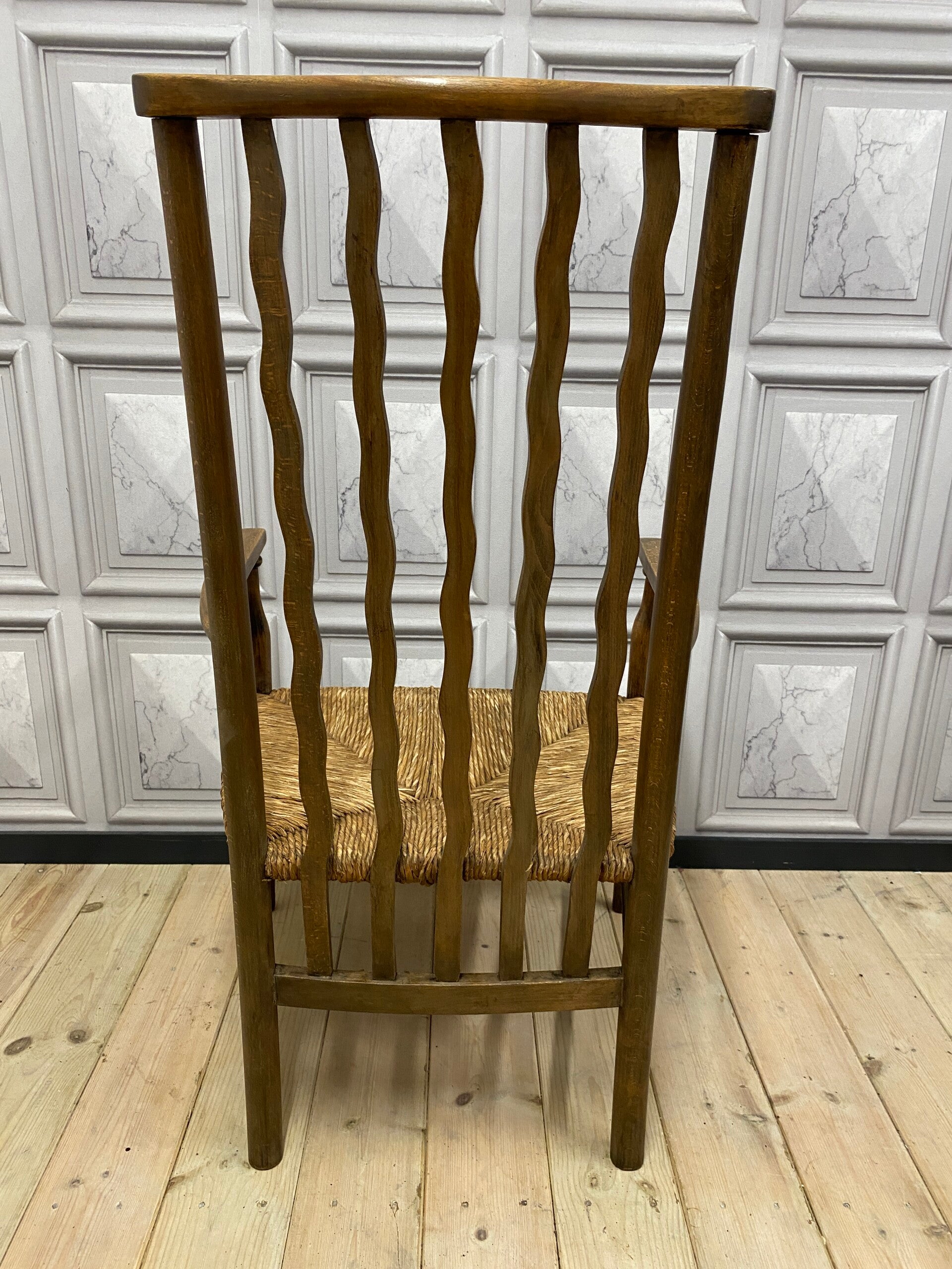 Featuring distinctive tall wavybackrest slats and turned front and rear legs joined by turned double stretchers.
